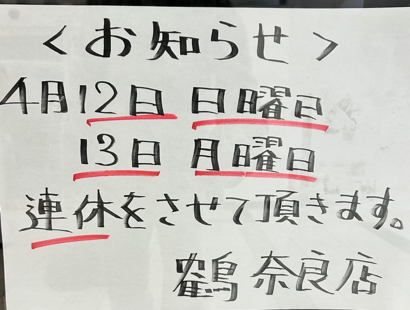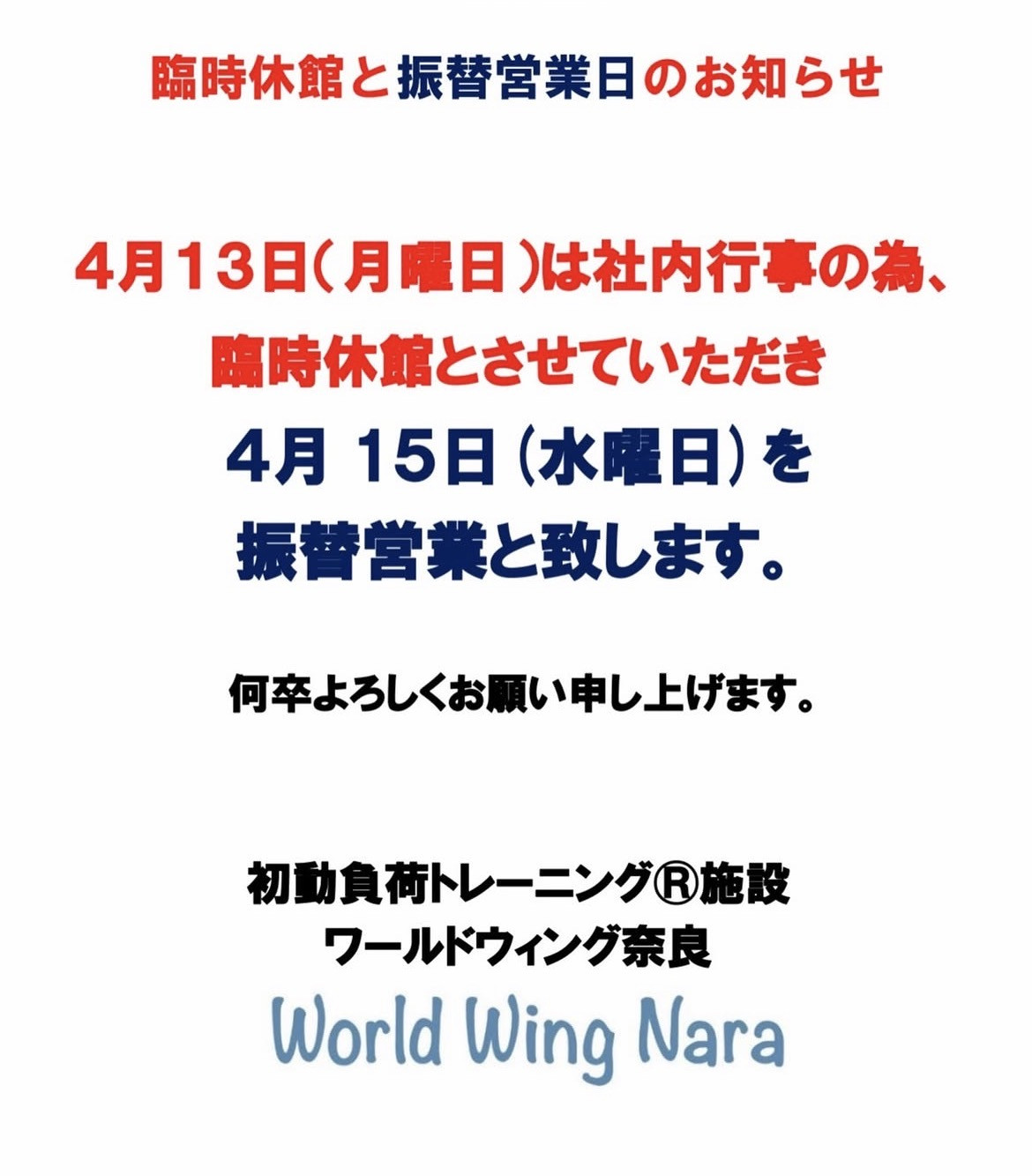 明日4月13日(月曜日)は社内行事の為、臨時休館とさせていただき、4月15日(水曜日)を振替営業と致します。